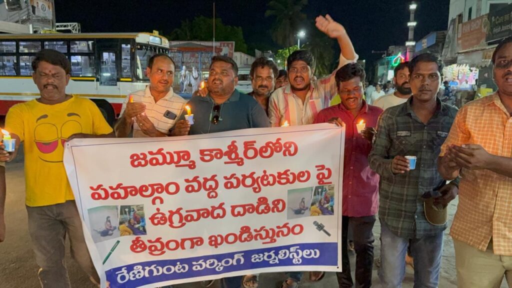 ఆత్మీయులను కోల్పోయిన వారికి రేణిగుంట జర్నలిస్టుల తరఫున సానుభూతి తెలుపుతున్నామన్నారు. అనంతరం కస్తూరిబాయ్ గాంధీ విగ్రహం నుండి పటం లోని పురవీధుల గుండా జర్నలిస్టులో క్యాండిల్ ర్యాలీ నిర్వహించారు. భారత్ మాతాకీ జై, వందేమాతరం అంటూ నినాదాలు చేశారు. ఉగ్రవాదం నశించాలంటూ నినాదాలతో పట్టణంలో జర్నలిస్టుల హోరెత్తించారు. ఈ కార్యక్రమంలో జర్నలిస్టుల ఉమేష్, చిన్నారావు, మణి, భాగ్యరాజ్, మధు, కృష్ణమూర్తి, సత్య రాజ్, మురళి యాదవ్, శివ, జలీల్, కృష్ణంరాజు, రమేష్, రాజశేఖర్, మురళి, గణేష్, అప్సర్,నాగూర్, మనోజ్ తదితరులు పాల్గొన్నారు.