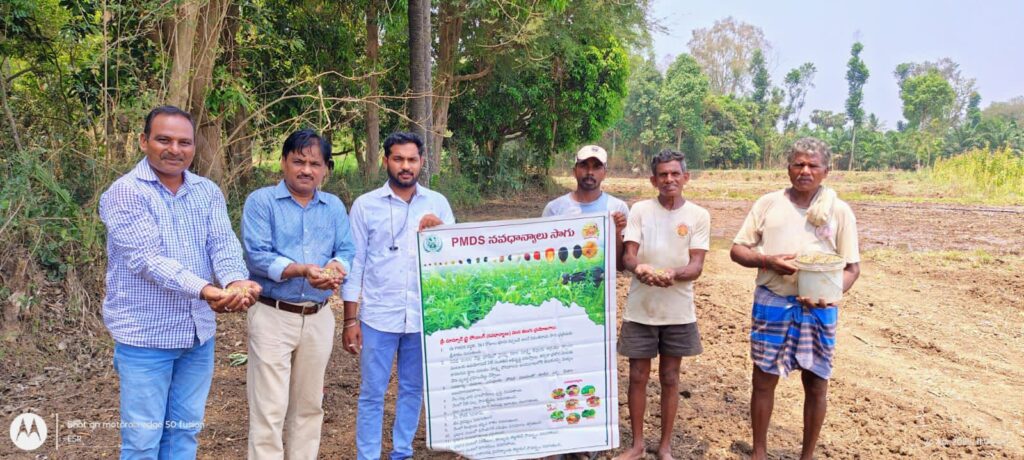 నవధాన్యాల సాగు మూడు నుండి ఐదు సంవత్సరాల పాటు చేపట్టడం ద్వారా ఎలాంటి ఎరువులు వాడకుండానే లేదా రసాయన ఎరువులు సగానికి తగ్గించి అధిక దిగుబడులు పొందవచ్చని రైతులు రేయ్యి వెంకట్రావు, లండ నారాయణరావు తెలిపారు. ప్రకృతి వ్యవసాయ ప్రాంతీయ శిక్షకులు హేమ సుందర్ వద్ద తమ అనుభవాలను వివరించారు. గత మూడు సంవత్సరాలుగా వేసవిలో పీఎండీఎస్ నవధాన్య విత్తనాలను వేసి పత్తి మరియు మొక్కజొన్న మూడు ఎకరాలలో సాగు చేస్తున్నానని భూమి ఆరోగ్యం మెరుగుపడటం వలన రసాయన ఎరువులపై పెట్టుబడి తగ్గడమే కాకుండా ప్రస్తుతం దిగుబడి కూడా పెరిగిందని అమ్మ వలస గ్రామ రైతు రెయ్యి వెంకట్రావు అన్నారు. అనంతరం కర్రివలసలో తమ వరి వ్యవసాయ క్షేత్రంలో గత ఐదు సంవత్సరాలుగా పీఎండిఎస్ నవధాన్య విత్తనాలను సాగు చేస్తున్నానని ప్రస్తుతం ఎలాంటి రసాయన ఎరువులు వాడకపోయినా, చుట్టుపక్కల రైతుల కంటే ఎక్కువగానే దిగబడి వస్తుందని దీనిని చూసి ఈ సంవత్సరం ఆ రైతులందరూ నవధాన్యాల సాగుకు ముందుకు వస్తున్నారని తాను కూడా తన పది ఎకరాల పత్తి , మొక్కజొన్న క్షేత్రాలలో ప్రస్తుతం పీఎండీఎస్ నవధాన్యాల వేస్తున్నానని దీనివలన కలుపు రాకుండా ఉంటుందని పంట ఆరోగ్యంగా ఎదగడమే కాకుండా అధిక దిగుబడి వస్తుందని రైతు లండా నారాయణరావు తెలిపారు ఈ సందర్భంగా ప్రకృతి వ్యవసాయ ప్రాంతీయ శిక్షకులు హేమ సుందర్ మాట్లాడుతూ మండలంలో రైతులు కొన్ని సంవత్సరాలుగామొక్కజొన్న తర్వాత మరల మొక్కజొన్న సాగు చేస్తూ ఉండడం వల్ల ప్రస్తుత మొక్కజొన్న పంట రసాయన ఎరువులకు స్పందించడం తగ్గడం వలన దిగుబడులు తగ్గుముఖం పట్టాయని దీనిని నివారించాలంటే ఏకైక మార్గం పీఎండీఎస్ నవధాన్యాలు విత్తనాలు సాగు చేసి కలియ దున్ని మొక్కజొన్నతో పాటుగా బహుళ పంటలు వేసుకుంటే దిగుబడులు గణనీయంగా పెరగడమే కాకుండా భూమి యొక్క భౌతిక స్వభావం మెరుగుపడి భూమిలో ఉన్న సూక్ష్మజీవుల వృద్ధి జరిగి పంటకు కావలసిన అన్ని రకాల పోషకాలు అందుతాయని అంతేకాకుండా మిత్ర పురుగుల వృద్ధి జరుగుతుందని భూమి యొక్క నీటి నిల్వ సామర్థ్యం పెరుగుతుందని వేసవిలో సారవంతమైన మట్టి కొట్టుకొని పోకుండా ఉంటుందని నేలలో సేంద్రియ కర్బన శాతం పెరగడం వల్ల రసాయన ఎరువులపై ఖర్చు తగ్గుతుందని కాబట్టి రైతులందరూ తప్పనిసరిగా పీఎండిఎస్ నవధాన్య విత్తనాలను కలియదున్నారని కోరారు ఈ కార్యక్రమంలో వ్యవసాయ అధికారి కొల్లి తిరుపతిరావు ప్రకృతి సేద్య సిఆర్పిలు విజయ్ తిరుపతి నాయుడు శ్రీను సురేష్ కుమార్, సుమలత పాల్గొన్నారు.