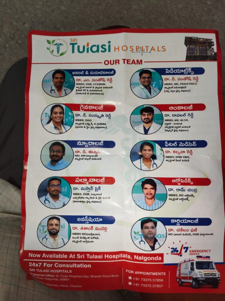 బ్రహ్మంగారిమఠం, గరుడ న్యూస్ (ప్రతినిధి): ఏ. ఓబుల్ రెడ్డి: మెరుగైన నాణ్యమైన వైద్య సేవలు అందించాలనే సంకల్పముతో డాక్టర్ సంతోష్ రెడ్డి డాక్టర్ కల్పనా రెడ్డి తులసి మల్టీ స్పెషాలిటీ హాస్పిటల్ జూన్ 1వ తేదీ న నల్గొండ పట్టణములో దేవరకొండ రోడ్డులోని భారత్ పెట్రోల్ బంక్ ఎదురుగా ప్రారంభించుటకు చీఫ్ గెస్ట్ గా రాష్ట్ర ఆరోగ్య శాఖ మాత్యులు శ్రీ దామోదర్ రాజ నరసింహ గారు మినిస్టర్ ఆఫ్ హెల్త్, మెడికల్ అండ్ ఫ్యామిలీ వెల్ఫేర్, సైన్స్ అండ్ టెక్నాలజీ, చీఫ్ గెస్ట్ హానరబుల్ శ్రీ కోమటిరెడ్డి వెంకటరెడ్డి మినిస్టర్ ఆఫ్ రోడ్స్ అండ్ బిల్డింగ్స్, హానరబుల్ నలమాడ ఉత్తమ కుమార్ రెడ్డి మినిస్టర్ ఆఫ్ ఇరిగేషన్ ఫుడ్ అండ్ సప్లయర్స్, గెస్ట్ఆఫ్ హానర్స్ శ్రీ కె జానా రెడ్డి ఎక్స్ సీఎల్పీ లీడర్, ఎక్స్ మినిస్టర్, హానర బుల్ కె రఘువీర్ రెడ్డి నెంబర్ ఆఫ్ పార్లమెంట్ లోక్ సభ నల్గొండ, హానరబుల్ శ్రీ గుత్తా సుఖేందర్ రెడ్డి చైర్మన్ లెజిస్లేటివ్ కౌన్సిల్, శ్రీ కె జయ వీర్ రెడ్డి మొదలగు ప్రముఖులు హాజరవుతున్నారు. కావున నల్లగొండ పట్టణ ప్రజలు పల్లె ప్రాంత ప్రజలు అందరు కూడా ఈ అవకాశాన్ని సద్వినియోగం చేసుకోవాలని కోరుతున్నారు.