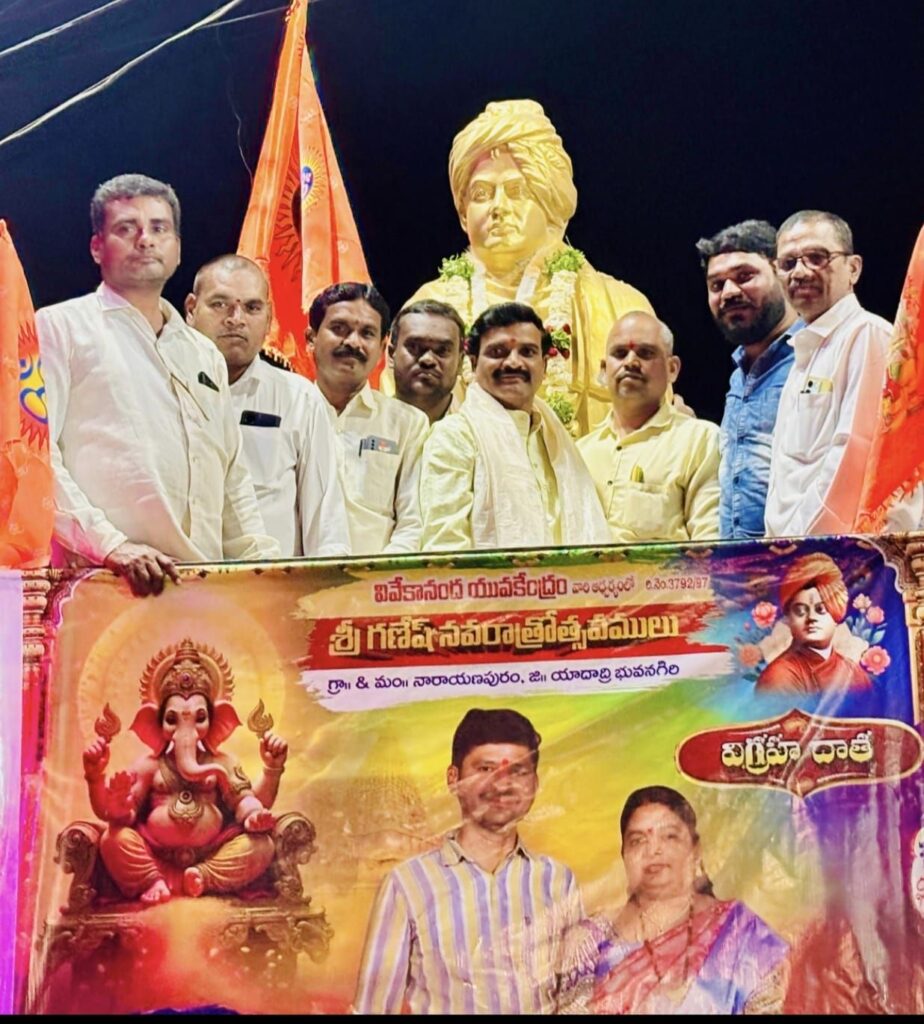 సంస్థాన్ నారాయణపురం మండల కేంద్రం వివేకానంద యువ కేంద్రం ఆధ్వర్యంలో నిర్వహిస్తున్న గణేష్ నవరాత్రి ఉత్సవాలలో భాగంగా మొదటి రోజున పూజా కార్యక్రమాలు నిర్వహించారు యువ కేంద్రం అధ్యక్షులు రాపర్తి వెంకటేష్ గౌడ్ – ఉషశ్రీ, దంపతులు రాపర్తి బుచ్చయ్య గౌడ్ – రాములమ్మ,దంపతులు మరియు సీనియర్ సభ్యులు సూరెపెల్లి జవహర్ – సరిత,దంపతులు,ఈ గణేష్ ఉత్సవాల్లో భాగంగా విగ్రహ దాతగా నిలిచారు పున్న బలరాం–మాధవి దంపతులు,మరియు మండపం దాతగా నిలిచారు స్ఫూర్తి కళాశాలల చైర్మన్ రాపర్తి సురేష్ గౌడ్ – సౌజన్య,దంపతులు.మొదటగా యువ కేంద్రం ఆధ్వర్యంలో స్వామి వివేకానందకు పూలమాల వేసి అనంతరం పూజా కార్యక్రమాన్ని నిర్వహించారు సర్వ సభ్యులు.ఈ కార్యక్రమంలో వివేకానంద ఉత్సవ కమిటీ అధ్యక్షులు సూరేపల్లి శివాజీ,వీరమల్ల జంగయ్య,సురేపల్లి వెంకటేశం,వంగరి రఘు,ఏలె పురేందర్,నర్ర ప్రశాంత్ రెడ్డి,రాసాల యాదగిరి,బల్లెం రామస్వామి,భక్తులు,గ్రామ ప్రజలు,తదితరులు,పాల్గొన్నారు.